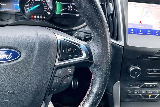 The thrills continue in the ST-Line cabin, which is detailed by heated ActiveX power front seats with Miko inserts, a leather-wrapped and red-stitched steering wheel, dual-zone automatic climate control, and versatile cargo space. Keeping connected comes easy, thanks to an 8-inch touchscreen, Android Auto®/Apple CarPlay®, WiFi compatibility, Bluetooth®, wireless charging, and a nine-speaker sound system. That means you enjoy both style and substance in our Edge!